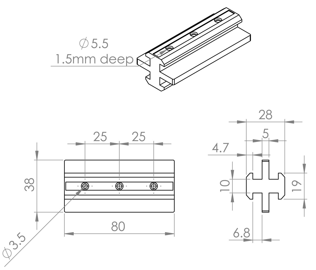El Deslizador Universal 30/45 está diseñado para permitir el deslizamiento suave entre perfiles de aluminio T-slot de las series 30 y 45. A diferencia de los modelos con superficie plana para accesorios, esta versión incorpora una geometría de guiado bilateral que proporciona un movimiento lineal rígido y con mínima holgura entre perfiles compatibles.